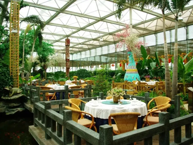 綠色生態(tài)餐廳完全按照標準溫室的結構建造,多采用文洛式,覆蓋材料多為PC板或者玻璃,結構保溫性能好,整齊規(guī)范,室內(nèi)各個空間溫度均勻,有利于景觀植物的生長,鑒于餐飲布局的需要,在文洛溫室結構的基礎上,可進行局部調(diào)整。該溫室建造成本相對較低,溫室升降溫能耗低,節(jié)約后期運行費用。